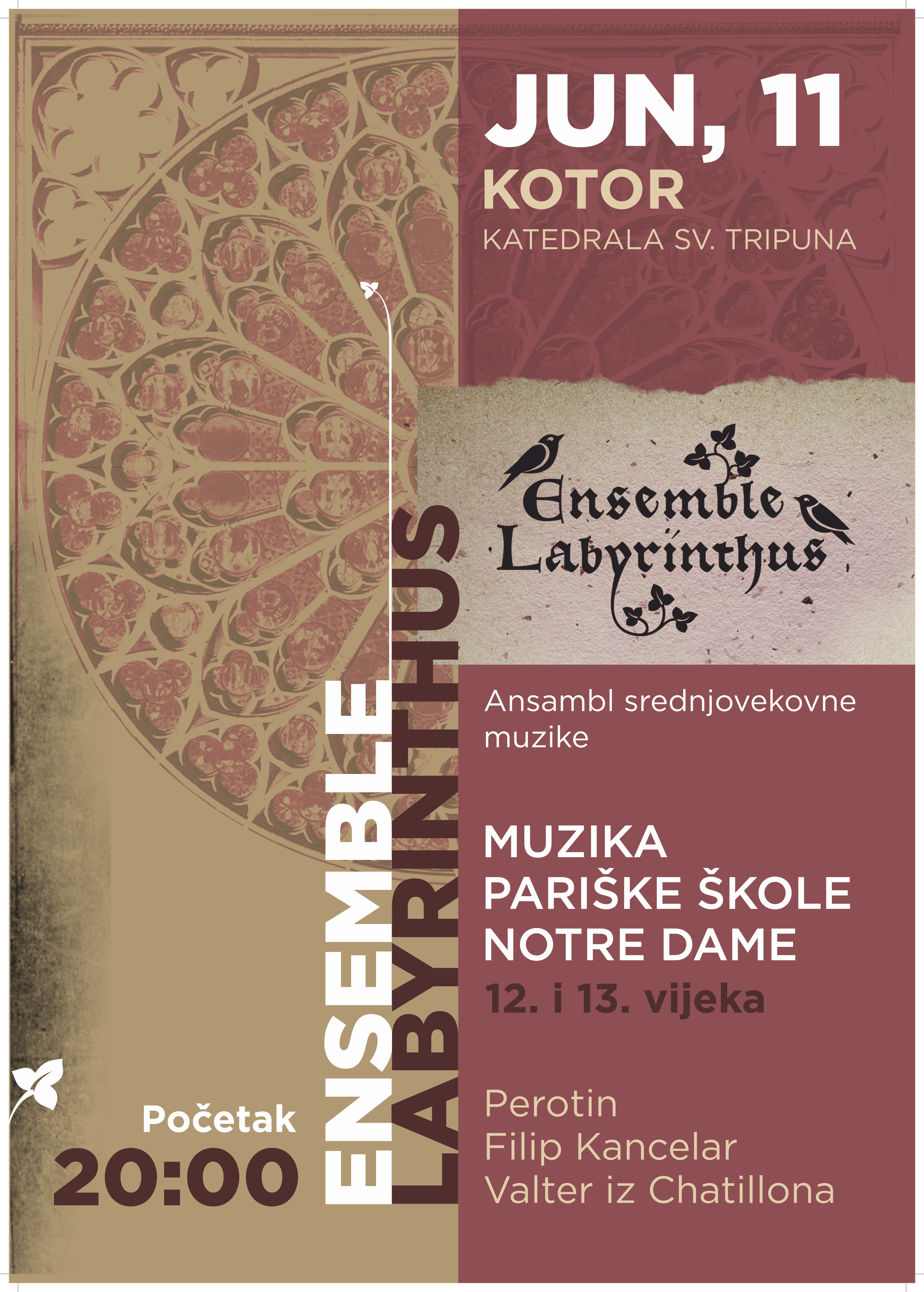 Na programu su djela čuvene pariške škole Notre Dame iz 12. i 13. stoljeća. Radi se o glazbi religioznog sadržaja (tipa conductus i rondo), koja nije bila namijenjena bogoslužju. Ovaj koncert je iznimno rijetka prilika za slušateljstvo u Crnoj Gori za slušanje srednjovjekovne glazbe u povijesno informiranoj izvedbi. Među glazbalima koja se uz glasove mogu čuti na koncertu su citole, gitara latina i chifonie, popularne u XIII.vijeku.