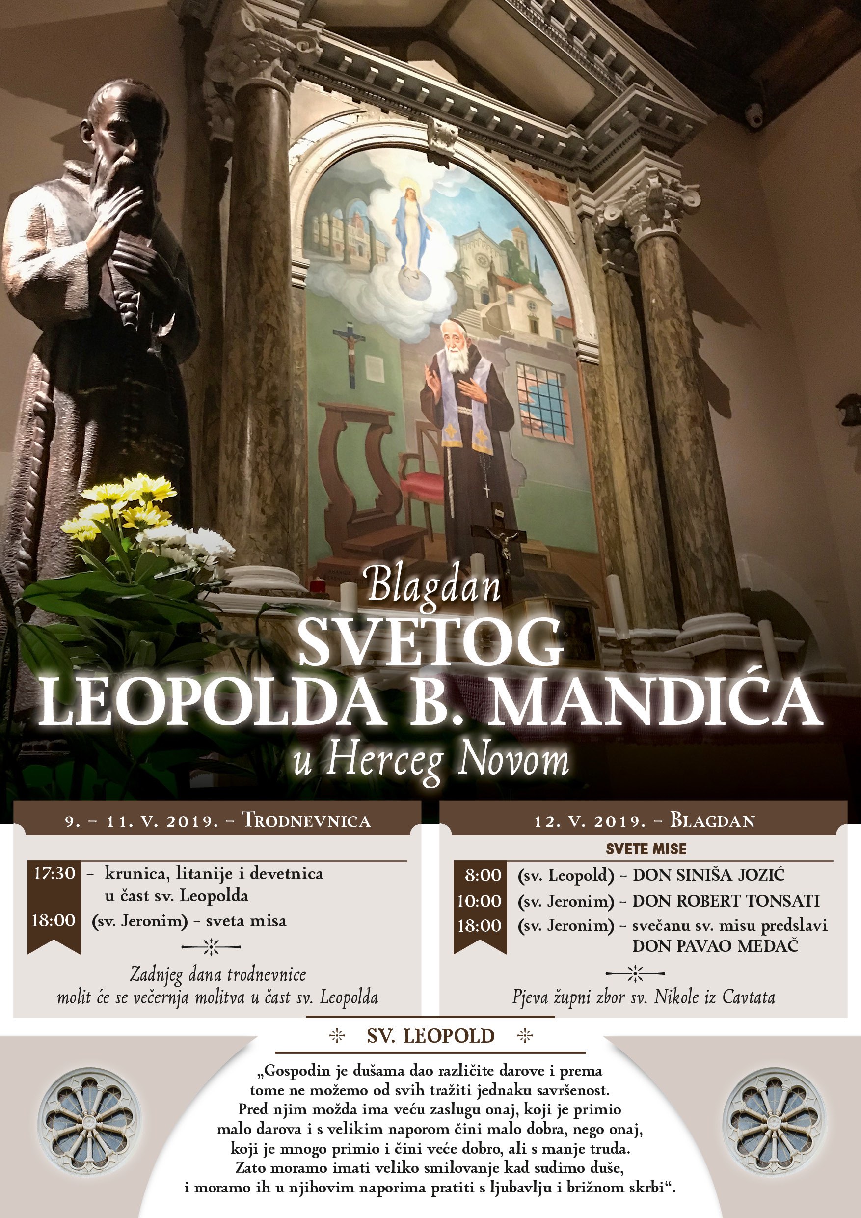 Blagdanu sv. Leopolda B. Mandića u njegovom rodnom gradu, Herceg Novom, prethodit će trodnevnica od 9. do 11. svibnja, s početkom u 17,30. U nedjelju, 12. svibnja slavit će se tri svete mise: u 8 sati u crkvi sv. Leopolda, te u 10 i 18 u župnoj crkvi sv. Jeronima. Više detalja na plakatu: