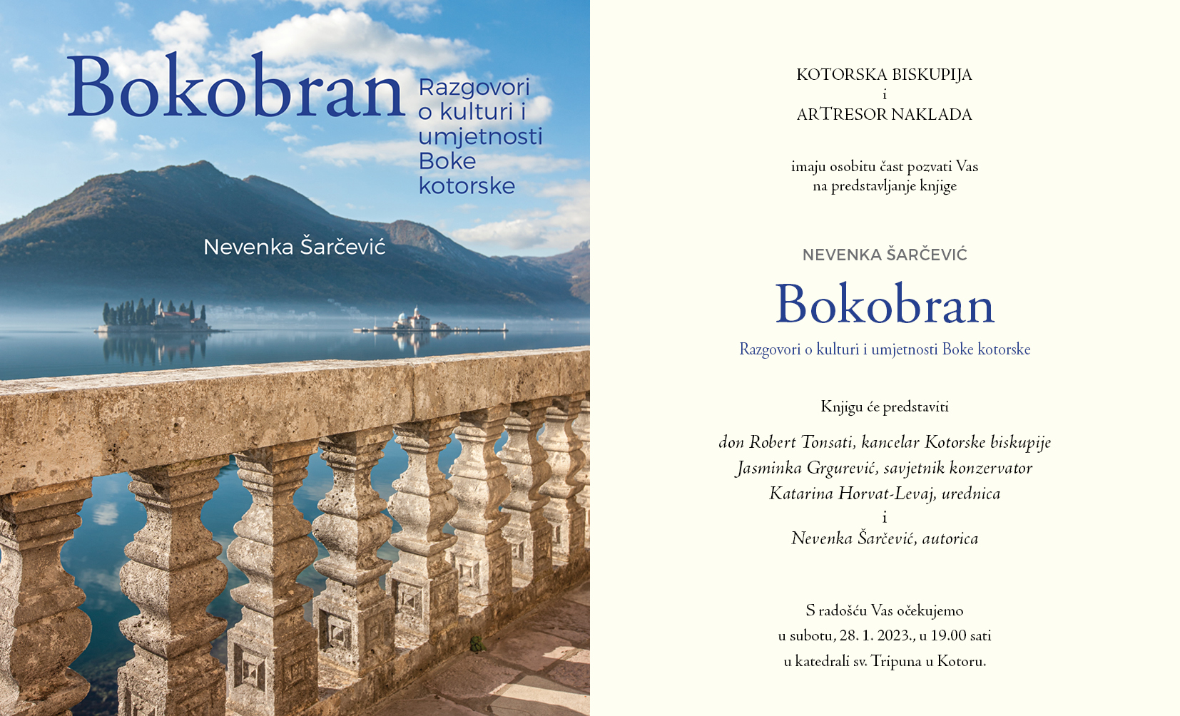 U subotu, 28. 1. 2023. s početkom u 19 sati u katedrali sv. Tripuna održat će se predstavljanje knjige “Bokobran – razgovori o kulturi i umjetnosti Boke kotorske” autorice Nevenke Šarčević, povjesničarke umjetnosti.