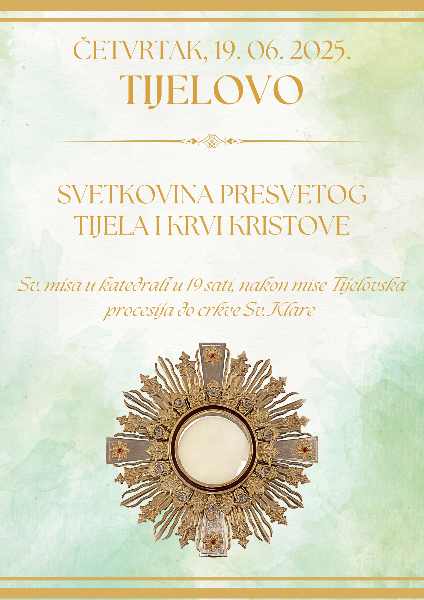 Proslava svetkovine Presvetog tijela i krvi Kristove – Tijelovo, ove godine bit će zajednička za župe: Kotor, Dobrotu, Škaljare i Muo. Sveta misa u katedrali bit će u 19 h, nakon mise uslijedit će Tijelovska procesija do crkve Sv. Klare u kojoj će biti završni blagoslov s Presvetim. Prije mise, prilika za sv. ispovijed od 18:30.
