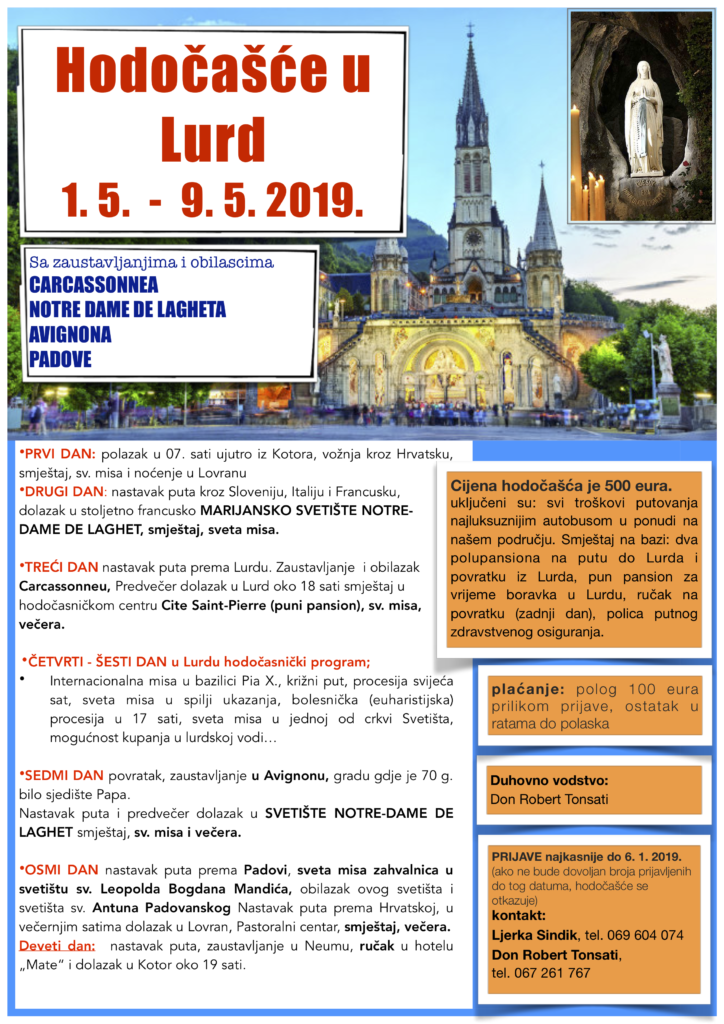 U svibnju 2019. biti će hodočašće vjernika Kotorske biskupije u Lurd (hodočašće je otvoreno i za vjernike drugih biskupija).