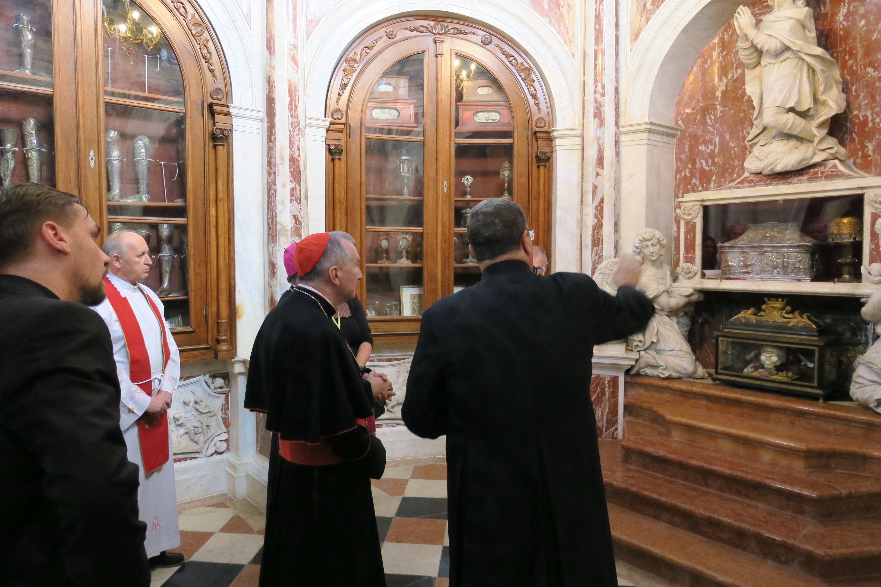 Nakon kratkog predaha, kardinal Parolin se najprije uz pratnju službenog vodiča upoznao s poviješću i znamenitostima grada Kotora, a zatim je posjetio katedralu sv. Tripuna kroz koju su ga proveli biskup i generalni vikar. Prilikom posjeta relikvijaru sv. Tripuna kardinal se zadržao u molitvi pred svečevim relikvijama.