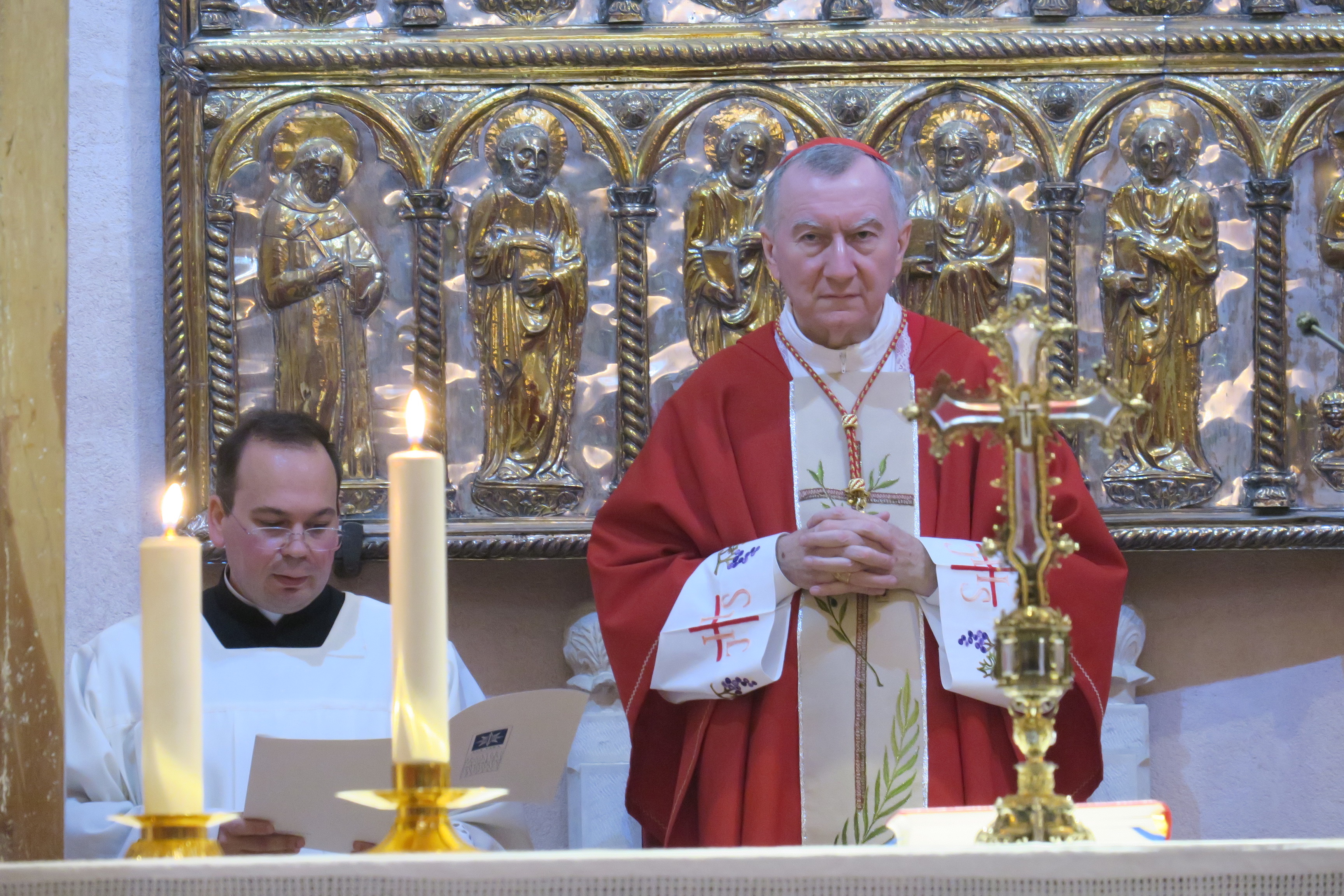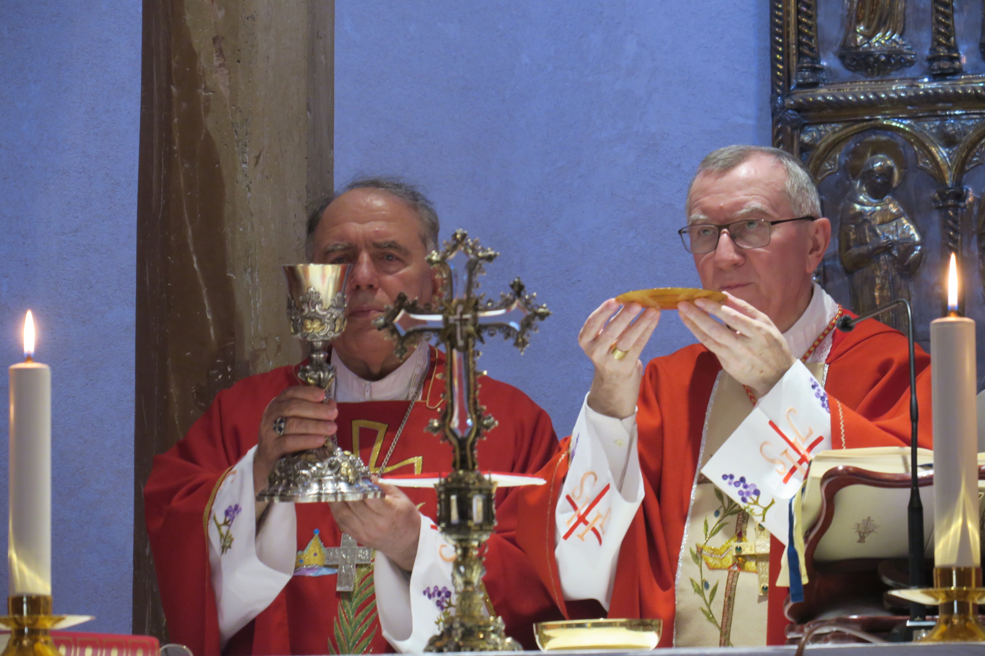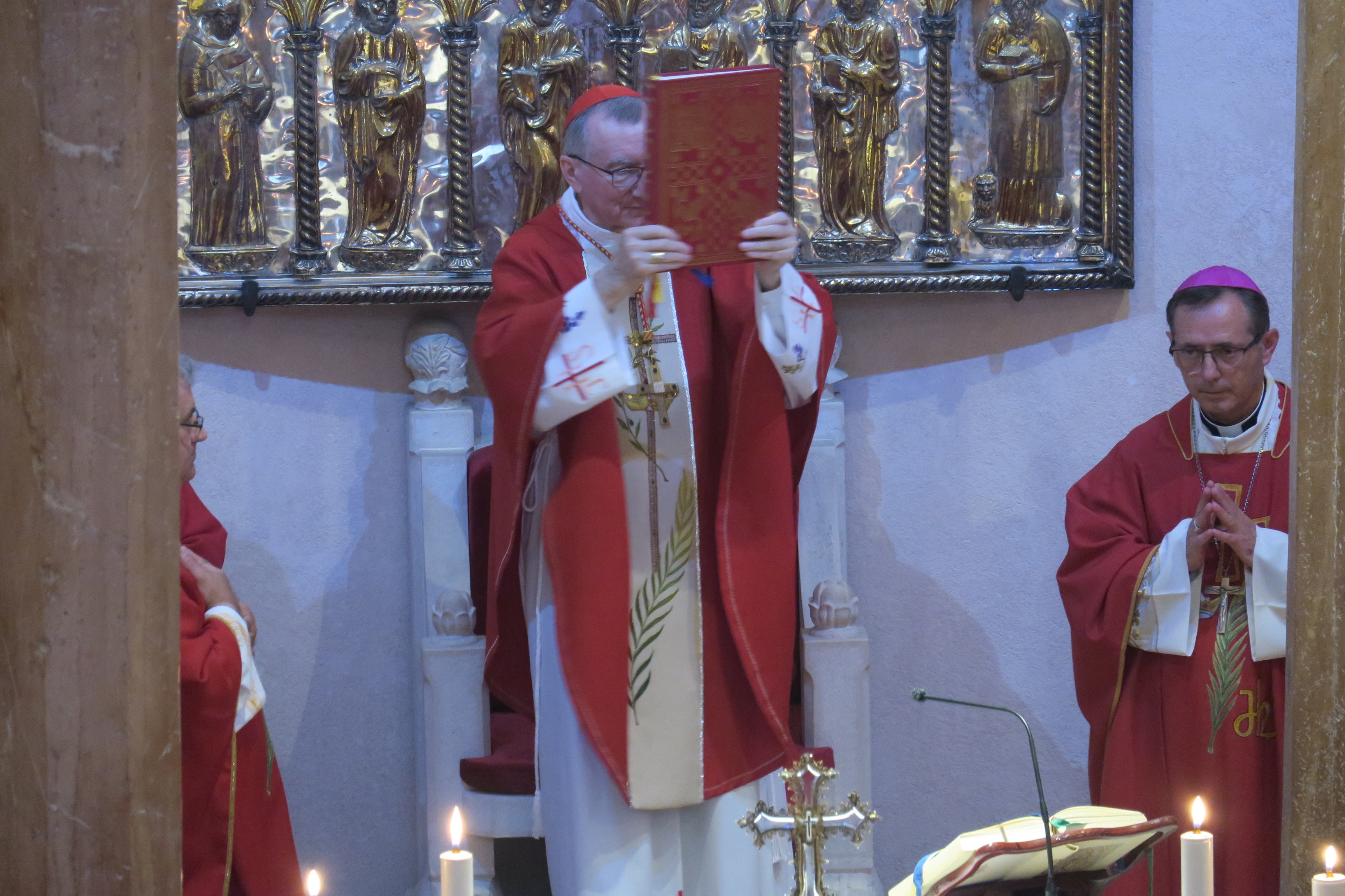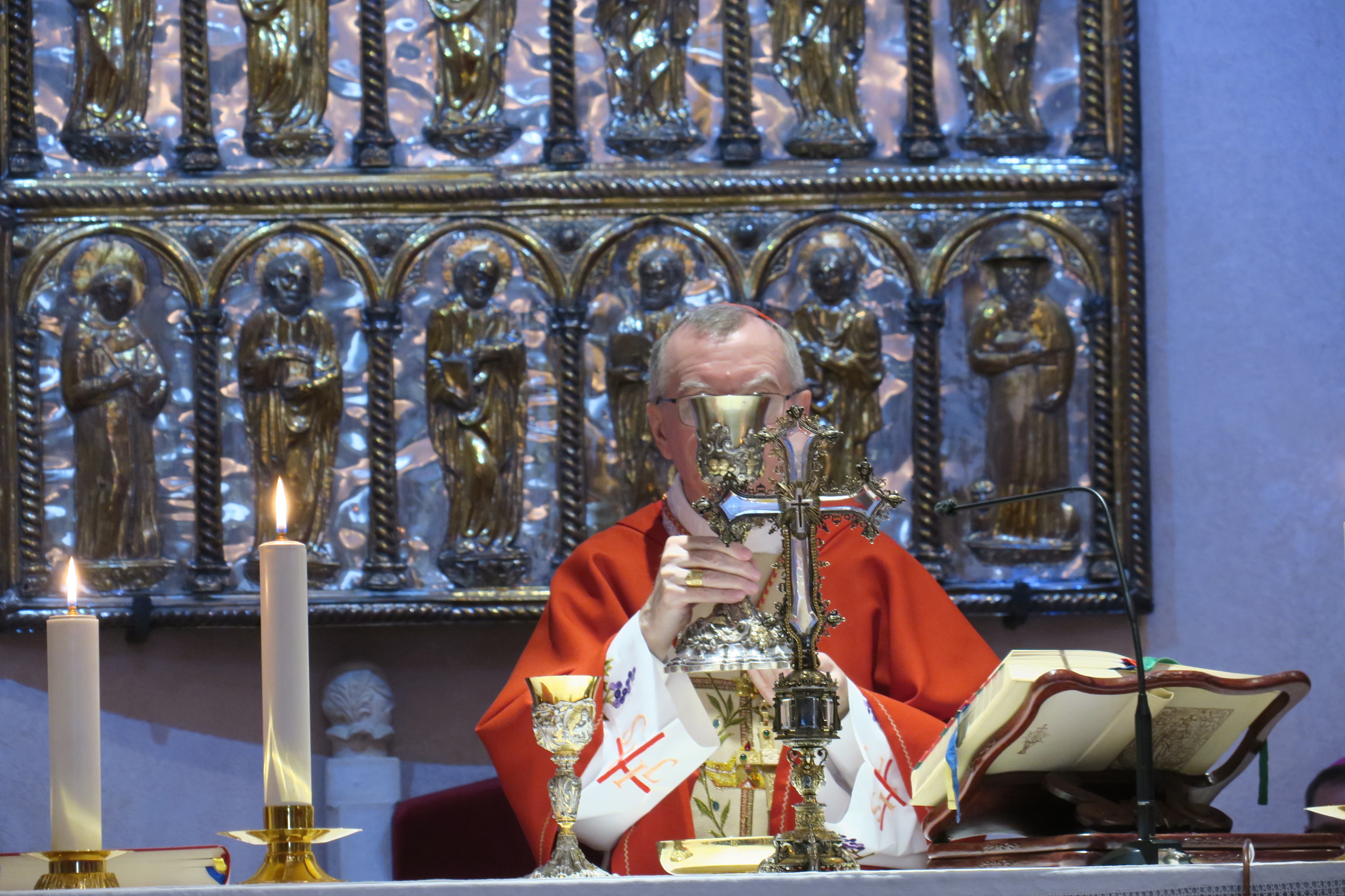 Neposredno nakon završetka kola sv. Tripuna, započelo je svečano misno slavlje u kotorskoj katedrali. Uz kardinala Parolina koncelebrirali su mons. Luigi Pezzuto, apostolski nuncij u Crnoj Gori i BiH, mons. Zef Gashi, barski biskup u miru, mons. Rrok Gjonleshaj, nadbiskup barski, mjesni biskup mons. Ilija Janjić, mons. Giovanni Gaspari, te brojni svećenici kotorske biskupije. Pozdrav je prije početka mise uputio biskup Janjić koji je poželio dobrodošlicu kardinalu u jednu od manjih biskupija svijeta, koja je unatoč svojoj veličini, iznjedrila tolike svece i velikane duha, te oblikovala povijest i kulturu tog područja. Na kraju pozdravnog govora mons. Janjić je uputio pozdrav i Svetom Ocu Franji, zamolivši kardinala da mu prenese sinovsku odanost i vjernost svih vjernika kotorske biskupije.