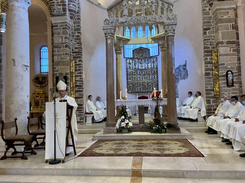 Mons. Gjonlleshaj je na početku propovijedi podsjetio na glavne sadržaje mise posvete ulje i primjene svetih ulja u sakramentima te je progovorio i o općem svećeništvu: „Krist je, naime, po vjeri Crkve na jedinstven način svećenik, prorok i kralj. Snagom svetoga krsta svi vjernici – a na poseban način snagom Svetog reda, mi izabrani i zaređeni služitelji Crkve sudjelujemo u ovoj Isusovoj svećeničkoj – posvetiteljskoj, proročkoj – učiteljskoj, kraljevskoj – pastirskoj službi. Obnovom naših svećeničkih obećanja budimo ono za što nas je Krist pozvao, odredio i poslao. Ime Krist na grčkom (hebrejski Mesija) znači Pomazanik. Duh Sveti je ulje kojim je Pomazanik pomazan. Po njemu se, Kristu Pomazaniku, zovemo i jesmo kršćani, pomazanici. Svaki od nas na svoj način, prema svome pozivu i redu nastavlja njegovo pomazaničko poslanje u svom vremenu. Danas je poseban dan naše svećeničke zahvalnosti, Božjeg milosrđa koje se očitovalo i po daru svećeništva koje smo primili. Danas se Crkva spominje niza otajstvenih događaja neposredno pred muku Gospodnju. U duhu, pođimo u dvoranu posljednje večere. Idimo zahvaliti Isusu za dar Euharistije, za dar svetog svećeničkog reda, za zapovijed ljubavi.“