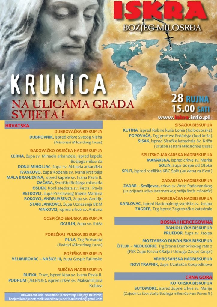 Prema dobivenim uputama Koordinacije štovatelja Božjega milosrđa, nositelja organizacije Iskre Milosrđa za Hrvatsku, Bosnu i Hercegovinu te Crnu Goru, molili su Krunicu Božjeg milosrđa, Zazive Božjeg milosrđa te molitvu sv. Ivana Pavla II. – Čin posvete svijeta Božjem milosrđu. Molilo se također za Svetu Crkvu Katoličku, Svetog Oca, svećenike, nova svećenička i redovnička zvanja, za umiruće te zaštitu od svih zala i nevolja – napose biča potresa i pošasti koronavirusa.