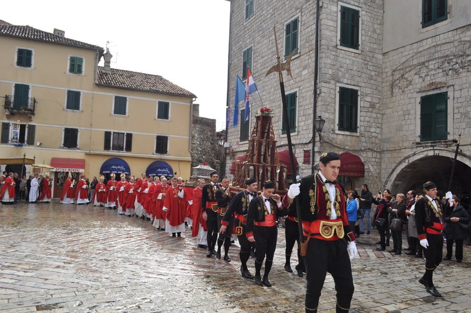 Po završetku euharistijskog slavlja, velika procesija svih sudionika slavlja u kojoj su nošene moći sv. Tripuna i moći drugih svetaca, krenula je ulicama grada, praćena pjesmama, zvonima i gradskim glazbama Kotora i Tivta. Ova živopisna procesija koja je obnovljena 2000 god. predstavlja jedinstveno svjedočanstvo kršćanskog identiteta i vjerničke baštine grada Kotora. Nakon procesije svi su okupljeni imali priliku cjelivati svečeve relikvije u katedrali.