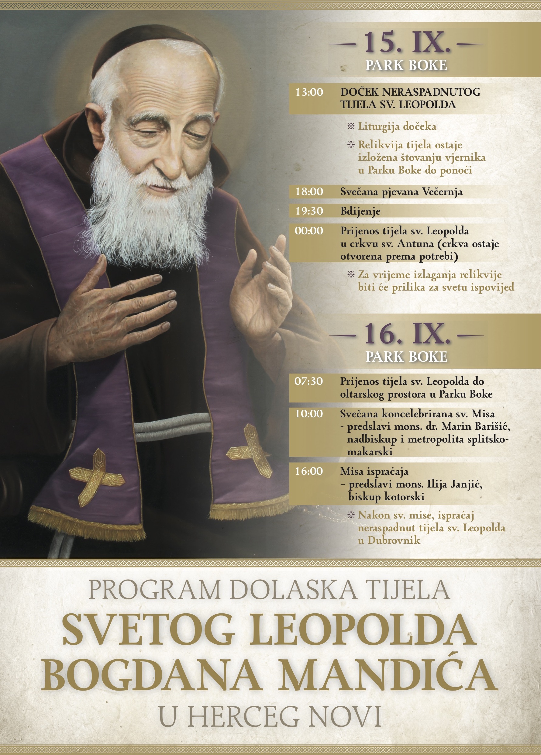 S velikom radošću iščekujemo dolazak relikvije tijela sv. Leopolda u njegov rodni grad, Herceg Novi, 15. i 16. 9. 2017. godine. Radujemo se, također, vašem dolasku i sudjelovanju u molitvenim i liturgijskim točkama programa. Pojedine točke tog programa možete naći i na priloženom plakatu.