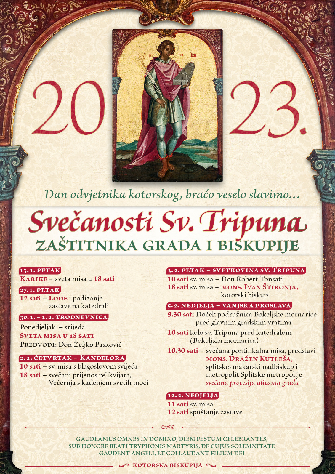 Dana 27. 1. Lodama i izvijanjem svečeva stijega objavit će se početak svečanosti. Duhovna priprava – trodnevnica bit će svakog dana od ponedjelja, 30.1. do srijede 1. 2. u 18 sati u Katedrali. Predvodi: don Željko Pasković. Uoči liturgijskog datuma svetkovine, na Kandeloru, bit će prijenos relikvijara, svečana pjevana Večernja i Služba čitanja s kađenjem svetih moći, u 18 sati, a 3. 2. slavit će se dvije svete mise u 10 i 18 h, večernju misu predslavi kotorski biskup mons. Štironja. Vanjska proslava biti će u nedjelju, 5. 2. a tom prilikom svečanu pontifikalnu misu predslavi mons. Dražen Kutleša, splitsko-makarski nadbiskup i metropolit splitske nadbiskupije, te apostolski administrator Porečke i Pulske biskupije. Svi detalji Tripundanskih svečanosti nalaze se na plakatu.