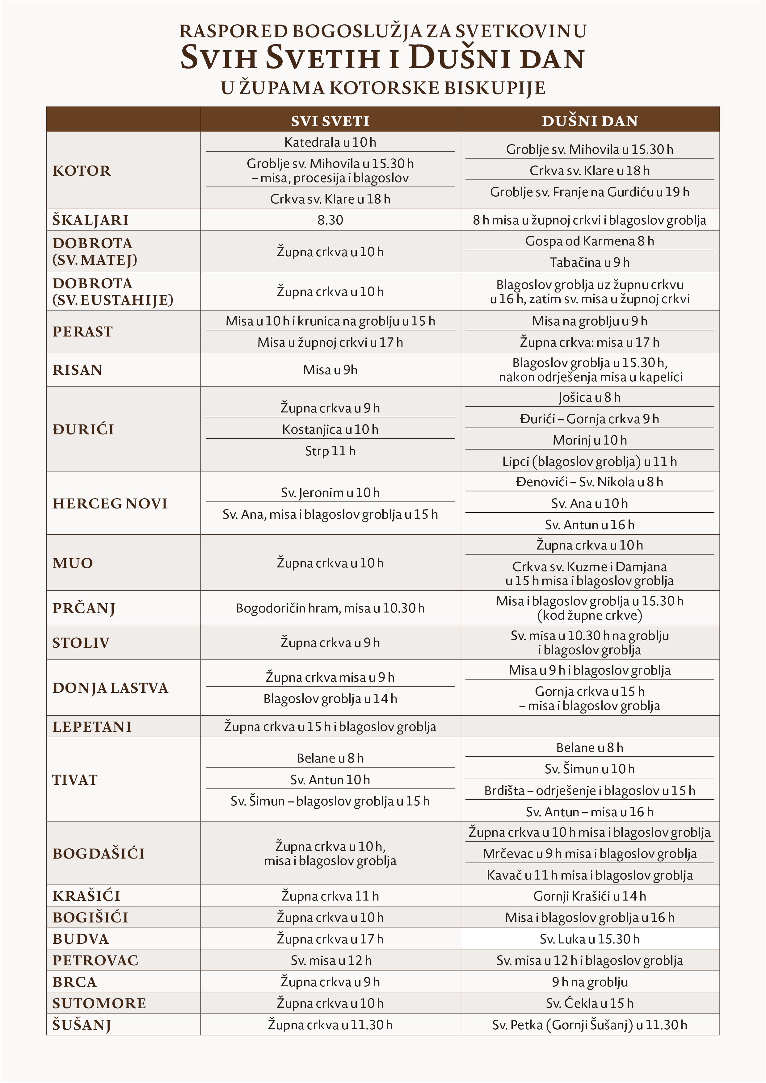 Raspored bogoslužja za svetkovinu Svih Svetih i Dušni dan u župama Kotorske biskupije
