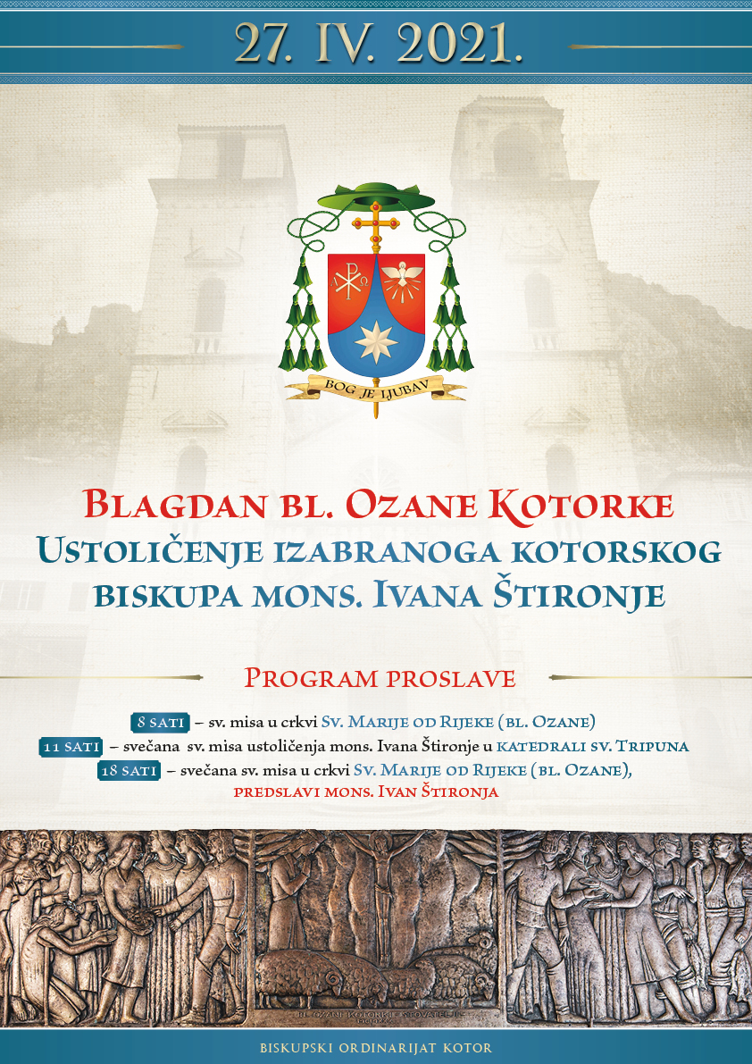 Na blagdan bl. Ozane Kotorke 27. 4. u Kotoru će se održati ustoličenje novoga kotorskog biskupa mons. Ivana Štironje. Biskupsko ustoličenje svečani je čin u kojem izabrani biskup kanonski preuzima biskupiju koja mu je od Sv. Oca povjerena na upravljanje i vodstvo. Sv. misa ustoličenja započet će u 11 sati u katedrali sv. Tripuna. Blagdanske svete mise u čast bl. Ozane biti će u 8 i 18 sati u crkvi sv. Marije od Rijeke (Koleđate) u kojoj počiva blaženičino neraspadnuto tijelo.