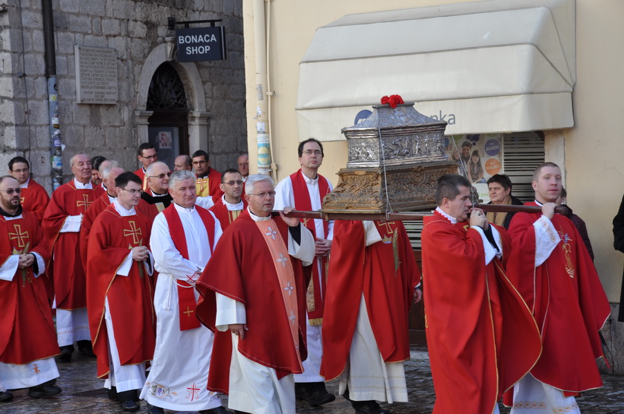 Nakon mise, u pratnji zvona i gradskih glazbi uslijedila je procesija s relikvijama svetog Tripuna i drugih svetaca ulicama grada Kotora, a svečanost je završila ljubljenjem relikvije „Slavne glave” sv. Tripuna.