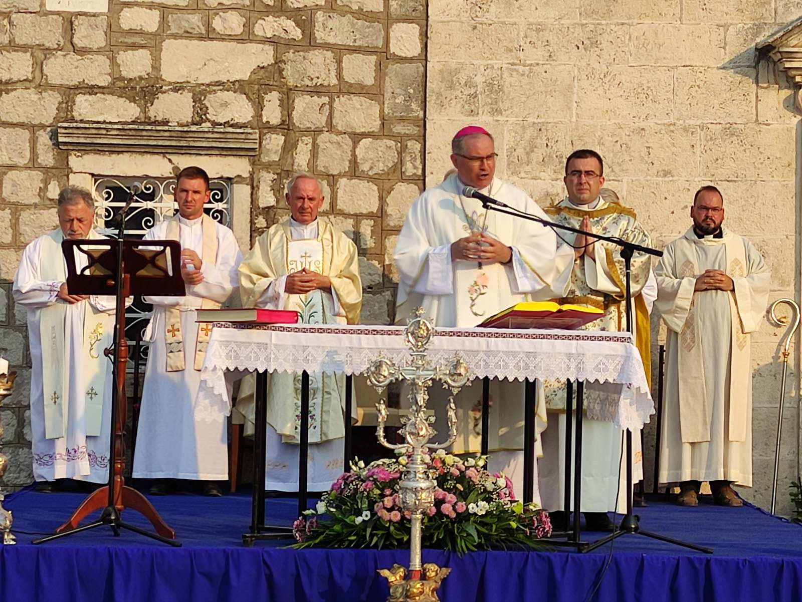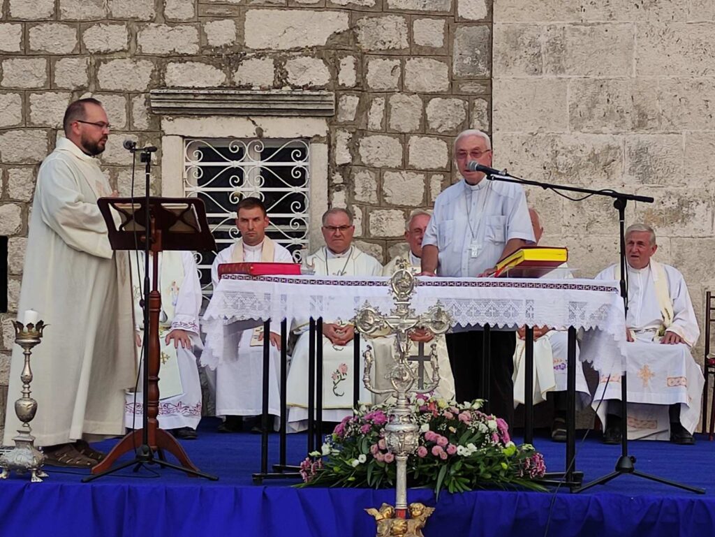 Dakle, i moj i tvoj život, brate i sestro, ogrnut je plaštem Božjega blagoslova i milosti, ogrnuti smo zaštitom i zagovorom svoje nebeske Majke Velike Gospe. To je ujedno i razlog našega hodočašća ovdje u ovo svetište. Kao što se u Gospinu životu ništa nije događalo bez Božjega znanja, ništa se bez Božjega promisla i znanja ne događa ni u našem životu. Zato nam valja biti u blizini Božjoj.“ Božje izabranje, poručio je biskup Ivan, ima dvostruki učinak, s jedne strane je to kruna radosti, a s druge križ žalosti, koji se mogu prepoznati u životu svakog vjernika, a posebno svećenika što je mogao iskusiti i sam slavljenik: „Neka ta radost i nas ovdje prisutne osposobi za služenje Isusu u braći ljudima, onako kako su to činili sv. Leopold Bogdan, bl. Gracije i bl. Ozana i ostali Božji ugodnici Boke. No, budimo svjesni, kao što je to Mariji bilo naviješteno u hramu, da će joj mač boli probosti srce, tako radost koju Gospodin pripušta može i nama donijeti žalost.